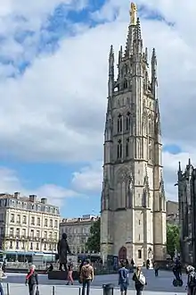 The Tour Pey-Berland (Pey Berland Tower), named for its patron Pey Berland, is the separate bell tower of the Bordeaux Cathedral, in Bordeaux at the Place Pey Berland.