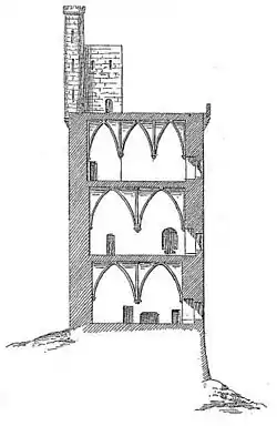 There is a second entrance with modest dimensions in the east wall.[lower-alpha 6] On the outside of the building the doorway is positioned above some projecting stonework that may have been intended as the bonding to a curtain wall that was never built. The entrance was perhaps originally served by a wooden staircase but when the gatehouse was constructed it gave direct access to the châtelain's residence. The doorway and four of the niches were blocked at the beginning of the 18th century when the two upper floors of the tower was used as a prison. They were unblocked as part of the restoration work carried out in the 1970s.[36][lower-alpha 7]