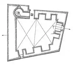 There are three floors with a single large room on each floor. The ceilings are 7.5 m (25 ft) in height.[26] The floors are connected by a well-conserved narrow spiral staircase only 1 m (3 ft 3 in) in width located in the northwest corner of the building.[26] The stairs are protected at the top by a rectangular turret. On the first two levels of the staircase there are slots in the external wall to admit light.[24] The roof terrace is 27 m (89 ft) above the ground. The turret projects another 7 m (23 ft) and the lookout tower extends a further 5 m (16 ft) giving a total height of 39 m (128 ft) for the structure.[14][24] The walls are 2.4 m (7 ft 10 in) in thickness on the ground floor, 2.2 m (7 ft 3 in) on the first floor and 2.0 m (6 ft 7 in) on the second.[24]