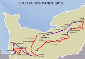 Tour de Normandie is a road bicycle race held annually in the region of Normandy, France. The race started in 1939, but was not held in the periods of 1940–1955 and 1960–1980. It was originally a race for amateurs, but was opened for professionals in 1996. The Tour de Normandie has been one of the races in the UCI Europe Tour since 2005, in the 2.2 category.[1] The race was not held in 2020 and 2021 due to the COVID-19 pandemic[2]