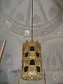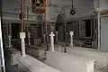 The south-west side opens into the chamber of the Beys,[1] the most important chamber in the complex, housing the tombs of thirteen reigning Beys.[7] The chamber is square, with walls fifteen metres long, and it replicates the proportions of an Ottoman mosque: four large cruciform pillars support a large central cupola which is slightly bulbous in form and flanked by four demi-cupolas on the sides and four in the corners. The only other building with this form in the medina of Tunis is the Sidi Mahrez mosque.[1][5] The intricate decoration of the room blends Italian, Ottoman and local influences; the lower parts of the walls and the pillars are covered in panels of polychrome marble marquetry to a height of 2.5 metres, while finely-sculpted plaster lines the caps of the cupolas.[5]