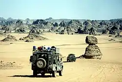 Most European desert tourists, either driving the own vehicles and entering Libya from Tunisia, or flying in to Tripoli for an escorted tour, had more than enough to fill their time visiting the spectacles of the Fezzan. At this time Libya was briefly a transit county for trans-Africa overlanders who crossed the country from Tunisia to Egypt. Exits into Sudan, Chad and Algeria were rare, although for a few years one could enter or exit Niger via Tumu along the so-called ‘Marlboro Piste’,[34][35] a smugglers' route and the old trans-Sahara caravan route from the Kanem–Bornu Empire.
