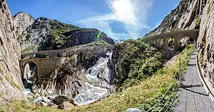 - Gotthard Massif, with the Gotthard Pass at its heart, notable for the historic Gotthard routes (north-south axis), the Matterhorn Gotthard Bahn railway (west-east axis) and the many other high road passes (Nufenen, Grimsel, Furka, Susten, Klausen, Oberalp and Lukmanier)