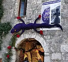 Tourrettes-sur-Loup holds an annual violet festival in March.[3] The village is decorated with violets, mimosa and other flowers, with the local cafés and restaurants providing edible violet specialities for the weekend. A farmers market including craft stalls is set up in the village square, with games for children. Traditionally there is a parade of flower-covered floats in the afternoon which culminates in a Battle of the Flowers - the riders of the floats pull all the flowers off and toss them to the crowd.