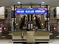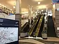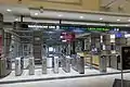 The station has two fare-collection entrances, one leading to a low platform station for use by the light rail Green and Blue Lines, and one leading to a high platform station for the heavy rail Red Line. Both entrances open from a lobby located on the lowest level of the Tower City shopping mall, and this lobby is accessible by escalators and elevators from the other levels of the mall. Each entrance has multiple fare gates along with two operator booths. The entrance for the Green and Blue Lines collects fares from passengers entering and leaving the station, since westbound passengers pay their fare upon leaving. The Red Line entrance collects fares from passengers entering the station and also requires arriving passengers to swipe their proof of payment card at the gate in order to exit the station.[6] In order to transfer from the Red Line to the Green or Blue Lines, or vice versa, passengers must exit through the fare gates at one station entrance and enter through the other station entrance. The high and low platform portions of the station could also be reached from each other without going through the lobby by an access ramp located along each side of tracks around the lobby; however, with the implementation of the proof of payment system on the Red Line, the ramps have been closed.