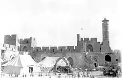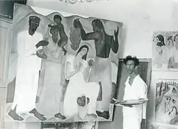 One of the most important exhibitions was that of the works by Reuven Rubin, who mounted an exhibition in the Tower in 1924. Rubin exhibited new works that showed the transition from the influence of the Christian tradition to paintings brimming with the symbolism of the Land of Israel.[2] Among the works that drew attention was the triptych “First Fruits” (1924), which received enthusiastic reviews by critics from various fields of culture such as Hayyim Nahman Bialik, Samuel (Schmuel) Hugo Bergman, etc. However the perception of Modernist painting that Rubin presented was not shared by all of the population. His album of woodcuts, “The Godseekers (1923)”, which he sent to the High Commissioner, was rejected because the High Commissioner did not “have any liking for that population of art objects”.[3] Views like those held by Rubin kept spreading among the young artists during the first half of the decade. At the same time "Bezalel" art continued to honor the values of Classicism, Jugendstil (Art Nouveau), and eastern European Realism.[4] The works of the “Bezalel” artists existed primarily within the space of applied arts, and they were characterized by the introduction of noncanonical branches of art – such as decoration and design – into high art in order to create a style".[5]