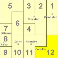 Rooks County was established with four townships: Bow Creek, Lowell, Paradise and Stockton. That number increased to seven by 1878[2] and twenty three in 1925. The twenty three townships were in place until 1971 when the number was reduced to the current twelve townships.[3]