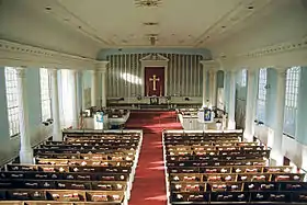 Towson United Methodist Church is an L-shaped structure, with the main sanctuary on a north–south axis. Designed by architect J. Alfred Hamme and completed in 1958, the church is built of red brick in the Georgian architectural style, with a prominent, floodlighted spire surmounted by a 9-foot (3 m) porcelain enamel gold cross visible at 3–5 mi (5–8 km) distance on the Beltway.[20] The imposing front facade is of cut stone from Pennsylvania, with the 18-foot (5 m) high main entranceway capped by a curved stone pediment.[8] Inside, the sanctuary has three aisles with a rear balcony and can accommodate up to one thousand persons. Rows of Corinthian columns standing on 4-foot (122 cm) bases flank the pews along both side aisles. The pulpit and doors are made of mahogany.