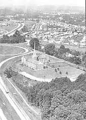 In April 1952, more than ninety years after the two churches split, the congregations of both finally voted to reunite, merging on June 1, 1952, and adopting the name Towson Methodist Church.[15] The members of both Methodist churches then began worshiping together at the First Methodist Church.[17] Plans to construct a much larger building with ample parking were announced when the two churches merged and 16 acres (65,000 m2) of undeveloped land, originally part of the Ridgelys' Hampton estate and north of the planned alignment of the Baltimore Beltway (I-695), were purchased soon thereafter from Goucher College.[4]