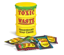 Toxic Waste is a line of sour candies owned and marketed by American company Candy Dynamics Inc., which is headquartered in Indianapolis, Indiana.[1][2] The products are sold primarily in the United States and Canada as well as several international markets such as the United Kingdom, Ireland and South Africa.[3] The toxic waste candy is packed in novelty drum containers, each holding 16 pieces of sour candy which come in five different flavors.