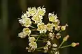 The flowers are cream coloured or white and grow in pointed clusters, flowering between April and July. They have three sepals and three petals.[4]