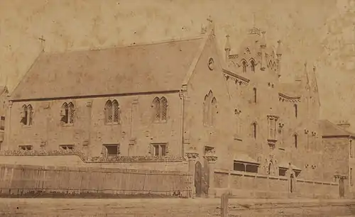 In 1829 George commissioned the famous architect, John Verge, to build Toxteth House on 39 hectares (96 acres) that he had acquired in Glebe. The original house built by Verge is shown below. It was a rectangular two-story building with single storey wings. It also had a stone flagged verandah around two sides of the house. The gardens were very elaborate and contained an orchard and even a large private cricket ground.[4] Over the years George Allen built several other houses on the estate including Tranby and Emslee which are shown below in the wide photo of the estate. In 1847 he built a Wesleyan Chapel on the grounds, a shown below.[5] George had a particular interest in horticulture and the grounds surrounding the house contained many different varieties of trees and flowers. In 1845 he entered the Horticultural Show and displayed flowers which included amaranthus, celosia, fuchsia, salvia and amaryllis. He also entered various varieties of apples, pears, figs, passionfruit medlars almonds and capsicum.[6]