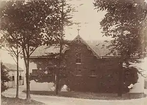 St Scholastica's was originally located in Pitt Street Sydney. It was opened as a high school by the Sisters of the Good Samaritan in 1878. However, in 1899 the Government decided to build Central Railway Station and several properties including the school owned by the Good Samaritan Sisters were resumed and demolished. Toxteth Park was purchased and the school was relocated to Glebe. The gates of the School in Pitt Street were brought to the new premises and are still used today.[11] A photo of the original school in Pitt Street showing the gates as they were in 1875 is below. A magnification of the gates on the left of the building is also given.