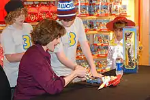 Toy Story 3 was featured in Apple's iPhone OS 4 Event on April 8, 2010, with Steve Jobs demonstrating a Toy Story 3-themed iAd written in HTML5.[48] Pixar designed a commercial for the toy Lots-O'-Huggin' Bear and formatted it to appear as if it came from an old VCR recording. The recording was altered with distorted sound, noise along the bottom of the screen, and flickering video, all designed to make it look like a converted recording from around 1983.[49] A Japanese version of the commercial was also released online, with the name "Lots-O'-Huggin Bear" replaced with "Little Hug-Hug Bear" (Japanese:ハグハグベアちゃん/Hagu Hagu Beya-Chan).[50]