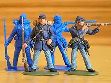 - Army men – unpainted, soft plastic toy soldiers sold inexpensively in bags or with terrain pieces and vehicles in boxed playsets