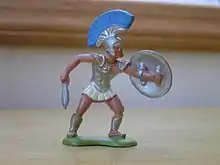 A toy soldier is a miniature figurine that represents a soldier. The term applies to depictions of uniformed military personnel from all eras, and includes knights, cowboys, American Indians, pirates, samurai, and other subjects that involve combat-related themes. Toy soldiers vary from simple playthings to highly realistic and detailed models. The latter are of more recent development and are sometimes called model figures to distinguish them from traditional toy soldiers. Larger scale toys such as dolls and action figures may come in military uniforms, but they are not generally considered toy soldiers.
