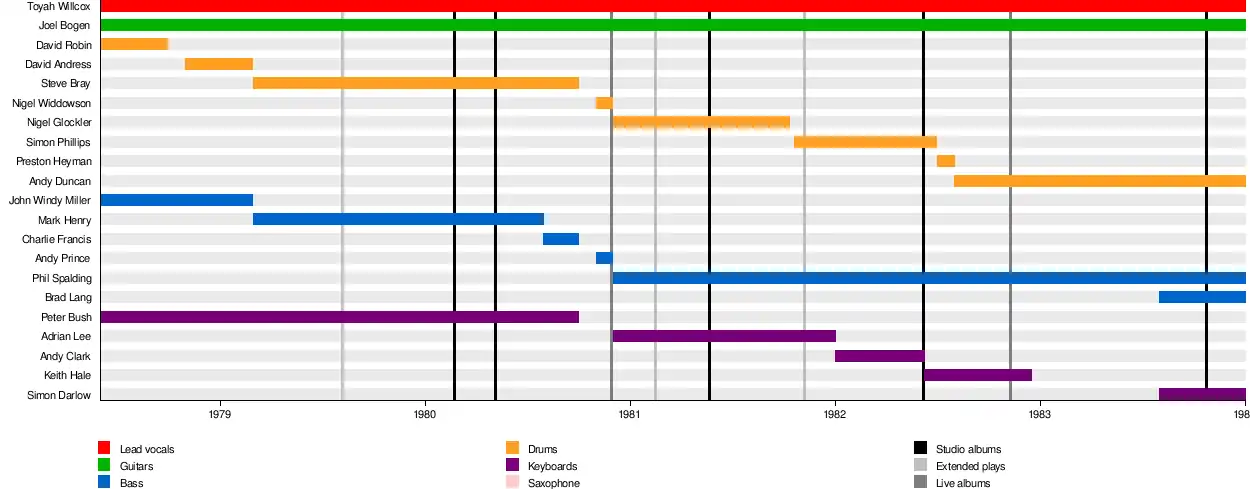 | Past members | Toyah Willcox Joel Bogen David Robin John Phillips Carrie Kotzberg Peter Stroud Nigel Elliot Miriam Stockley Lynn Garner |