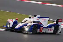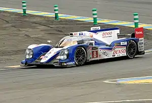 At Le Mans, the No. 8 Toyota qualified fourth, three-tenths ahead of the sister TS030 Hybrid in fifth, but off the pace of both Audi cars.[58] The race started on a damp and slippery track with the two TS030 cars driving faster than they had done in qualifying, moving up the field and separating the first five runners. As the track dried, Toyota dropped back from the quicker Audi cars, but had better fuel mileage. This recurring pattern continued into the night when the No. 7 and 8 Toyota vehicles took over second and third places after two of Audi's entrants ran into problems. Rain fell overnight and Toyota's tyre strategy enabled their cars to narrow Audi's lead to below two minutes. The positions remained constant until heavy rain fell on the track in the final hour, and Lapierre in the No. 8 Toyota aquaplaned into the barriers, requiring swift and extensive car repairs, and finished fourth overall. The No. 8 Toyota of Buemi gained on Kristensen's No. 2 Audi in the closing stages, but was too far behind to effect any positional change and came second.[59][60] Starting from the 6 Hours of São Paulo, Davidson, Buemi and Sarrazin took part in the next two races while Wurz and Lapierre focused on developing Toyota's 2014 car and Nakajima concentrated on a joint Super Formula and Super GT programme.[61]