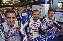 In early 2012, Toyota named seven drivers to the team. Sébastien Buemi, the third driver for the Red Bull Racing Formula One team, had no prior experience of endurance motor racing.[5] Former Williams Formula One and Formula Nippon driver Kazuki Nakajima also came from an open wheel racing background.[27] Anthony Davidson was added to the team for his previous experience with sports cars,[4] while Nicolas Lapierre transferred from Team Oreca's Le Mans squad.[4] Alexander Wurz also had extensive experience of sports car racing having twice won the 24 Hours of Le Mans.[4] Stéphane Sarrazin was employed by Toyota in May 2012 to replace Hiroaki Ishiura who withdrew following the completion of the car's first testing session due to back discomfort.[28] Super GT competitor Andrea Caldarelli served as the team's junior driver.[4]