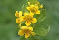 Tozzia alpina is a herbaceous, perennial plant, reaching heights of 10 to 50 centimetres (3.9 to 19.7 in). The quadrangular stem is hairless in the lower part, hairy on the edges in the middle and upper part.[3] The simple, bright green leaves are broad, ovate, serrate, with a length of 1 to 3.5 centimeters, a rounded or slightly heart-shaped basis, and a sharp upper end.[3]