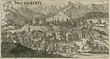 A first settlement named Forum in Lubelino was founded on the Roman road that ran from the ancient city of Emona (in present-day Ljubljana) via Loibl Pass to Virunum and the Zollfeld plain in the Noricum province (present-day Carinthia). After a massive landslide caused by an earthquake, the original settlement was destroyed and many people moved down the valley to establish a new village named Neumarktl in German where Tržič is now located (these events are the basis of the legend about the origin of Tržič).