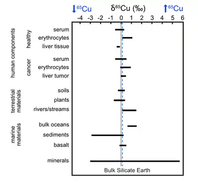 57. Balter V, Nogueira da Costa A, Bondanese VP, Jaouen K, Lamboux A, Sangrajrang S, et al. (January 2015). "Natural variations of copper and sulfur stable isotopes in blood of hepatocellular carcinoma patients". Proceedings of the National Academy of Sciences of the United States of America. 112 (4): 982–5. Bibcode:2015PNAS..112..982B. doi:10.1073/pnas.1415151112. PMC 4313854. PMID 25583489.