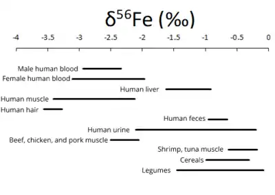 Iron isotope variations in humans reflects a number of processes. Specifically, iron in the blood stream reflects dietary iron, which is isotopically lighter than iron in the geosphere.[26] Iron isotopes are distributed heterogeneously throughout the body, primarily to red blood cells, the liver, muscle, skin, enzymes, nails, and hair. Iron losses in the body (intestinal bleeding, bile, sweat, etc.) favor the loss of isotopically heavy iron, with mean losses averaging a δ56Fe of +10‰.[26] Iron absorption in the intestine favors lighter iron isotopes.[26] This is largely due to the fact that iron is carried by transport proteins and transferrin, both of which are kinetic processes, resulting in the preferential uptake of isotopically light iron.[26]