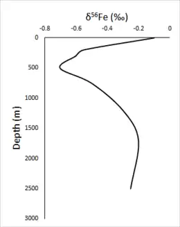 There are slight iron isotopic variations in the oceans relative to IRMM-014, which likely reflect variations in the biogeochemical cycling of iron within a given ocean basin. In the southeastern Atlantic, δ56Fe values between -0.13 and +0.21‰ have been measured.[29] In the north Atlantic, δ56Fe values between -1.35 and +0.80‰ have been measured.[30][31] In the equatorial Pacific δ56Fe values between -0.03 and +0.58‰ have been measured.[32][33] The supply of aerosol iron particles to the ocean have an isotopic composition of approximately 0‰.[1] Dissolved iron riverine input to the ocean is isotopically light relative to igneous rocks, with δ56Fe values between -1 and 0‰.[1]