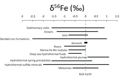 Most modern marine sediments have δ56Fe values similar to those of igneous δ56Fe values.[1] Marine ferromanganese nodules have δ56Fe values between -0.8 and 0‰.
