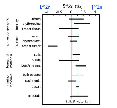 101. Larner F, Woodley LN, Shousha S, Moyes A, Humphreys-Williams E, Strekopytov S, Halliday AN, Rehkämper M, Coombes RC (January 2015). "Zinc isotopic compositions of breast cancer tissue". Metallomics : Integrated Biometal Science. 7 (1): 112–7. doi:10.1039/c4mt00260a. PMID 25489714.