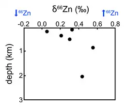 69. Maréchal CN, Nicolas E, Douchet C, Albarède F (May 2000). "Abundance of zinc isotopes as a marine biogeochemical tracer". Geochemistry, Geophysics, Geosystems. 1 (5): 999GC–000029. Bibcode:2000GGG.....1.1015M. doi:10.1029/1999GC000029.
