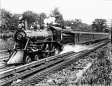…at a velocity of 15 miles an hour [24 km/h] the water is lifted 7+1⁄2 ft. [2.3 m], this was exactly the result attained in practice by the apparatus; at this speed the water was raised to the top of the delivery pipe (7+1⁄2 ft. [2.3 m]), and was there maintained without running over into the tender whilst the scoop was in action. Again, theoretically the maximum amount of water the pipe was capable of raising was 1,148 gallons [5,220 l]—5 tons—and this was reached when the engine was moving at the rate of about 80 miles an hour [130 km/h]. The result of experiments made at different speeds was that at 22 miles an hour [35 km/h] the delivery was 1,060 gallons [4,800 l]; 33, 1,080; 41, 1,150; and 50, 1,070 [53, 4,900; 66, 5,200; and 80, 4,900]; showing that the quantity delivered varies very little at speeds above 22 miles an hour [35 km/h], which is accounted for by the shorter times the scoop is passing through the water.[1]