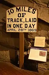 The ten-mile rail segment laid in 1869 (and the Promontory Golden Spike site) was bypassed in 1903 with the completion of the Lucin Cutoff,[22] although service continued for several years on the original route, which the Southern Pacific called its Promontory Branch.[23][24] The abandoned rails were eventually taken up for scrap and reuse in 1942.[25][26] At the Golden Spike National Historical Park, the West Auto Tour is a 7-mile (11 km) route that takes tourists to a replica of the sign erected by the CP at the site to commemorate the April 28 record.[27] The original sign is thought to be in the Utah State Capitol building in Salt Lake City; a replacement sign that may have stood at the site is on display at the visitor's center in Promontory, and a replica is displayed at the California State Railroad Museum in Sacramento.