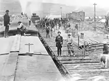 The next day, work began at daybreak. One railcar, fully loaded with 8 pairs of 30-foot (9.1 m) rails, spikes, and other supplies, was pulled up to the end of the track by teams of horses; when it met an empty car returning to the supply base, the empty car was tipped on its side to allow the loaded car to pass.[14] As the loaded car reached the end of the line, one pair of rails was pulled down and laid over the ties by a team of four rail handlers, then the car was advanced over the loose rails while another team of spikers started spikes to secure the rails. Additional teams finished the spiking and buried the ends of the ties.[14]