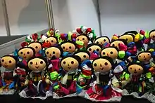 One important category of toys is that of dolls. They have been made from various materials and some have become iconic. Oaxaca is famous for rag dogs dressed in local indigenous dress.[24] In Mexico City, dolls called “Marías” are also made from cloth and dressed to imitate indigenous women. These often carry babies and are also adorned with ribbons and fringe/lace.[24] María dolls are well known among tourists in Mexico, even if they do not know what they are called. The dolls are made of cloth and are dressed similar to the traditional dress of Mazahua women, an indigenous group found in the State of Mexico and Michoacán. They are often sold on the street by women who make them. The filling is a material called guata, which is designed for the purpose. Culturally they are important because they present a traditional Mexican image, in contrast to commercially made dolls.[25] Lesser known are cartonería, or Lupita dolls, which are of a very hard papier-mâché. They were originally created to imitate expensive porcelain dolls from Europe.[11][15] Another European style “doll” are marionettes. Traditional marionettes are made in Puebla using brightly colored cloth for the body and appendages, but the hands, feet and head made of ceramic. Generally, these depict witches, bullfighters, devils, horses and clowns as well as famous characters such as Don Juan Tenorio and Doña Inés.[24] Marionettes were staples of puppet shows, which often were performed by roaming individuals or groups at local fairs and parties and miniature home puppet theaters became popular in the 19th century and remained so until the mid 20th century. They were also used for teaching Catholic doctrine to children. In the early 20th century, these marionettes also included more modern and international characters such as Popeye, Charlie Chaplin, Cantinflas and soldiers.[11] Corn husks are used in a variety of ways, including in the making of crafts like toys. Many are used to make small dolls. The husks are wrapped around bunched grasses, a corncob, or bamboo. After assembly the pieces are brightly painted with aniline dyes.[26]