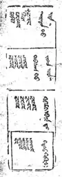 A printing stock found in eastern Mongolia in the 1920s documents a historical custom of eating a piece of paper with words printed on it, in order to prevent or heal maladies. On fields of about 24x29 mm magical incantations in Tibetan are printed, along with use instructions in Mongolian. The practise apparently was part of lamaist popular medicine.[9]