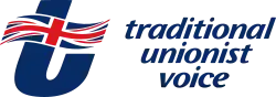 The Traditional Unionist Voice (TUV) is a small unionist and loyalist[6] political party in Northern Ireland.[7] The party was founded in December 2007 after splitting from the Democratic Unionist Party (DUP), opposing its acceptance of power-sharing with Sinn Féin[8] Its founder and leader is Jim Allister who, until 2009, sat as an independent Member of the European Parliament, having been elected for the DUP in 2004.[9][10] Its party president is William Ross.[11] The TUV is right-wing and socially conservative. It opposes the Good Friday Agreement, particularly mandatory power-sharing with Irish nationalists and political co-operation with the Republic of Ireland.