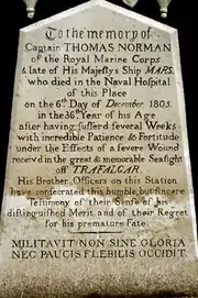 The Southport Ditch Cemetery was used for interments between 1798 and 1814, after which it fell into disuse. The only exception was the grave from 1838 at the northeast corner of the cemetery, near Prince Edward's Gate.[8][9] The renaming of the graveyard to commemorate the Battle of Trafalgar apparently did not occur until many years after the victory. Only two of the interments are of those who died of wounds sustained during the battle.[8][9] One of the victims was Captain Thomas Norman of the Royal Marine Corps and HMS Mars, who died in the Naval Hospital on 6 December 1805 at the age of 36.[12] The other was Lieutenant William Forster of HMS Colossus, who died of the wounds that he received in battle on 21 October 1805 at the age of 20.[9][12] A plaque mounted by the Southport Gates reads: "Trafalgar Cemetery - Here Lie The Remains of Some Who Died of Wounds at Gibraltar After Nelson's Great Victory in October, 1805, Those Killed During The Battle Having Been Buried at Sea. Other Graves Date From 1798."[13]