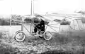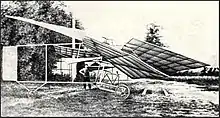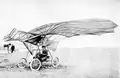 By December 1905 Vuia had finished construction of his first airplane, the "Vuia I". This was a high-wing monoplane constructed entirely of steel tubing. The basic framework consisted of a pair of triangular frames, the lower members forming the sides of the rectangular chassis which bore four pneumatic-tyred wheels, the front pair steerable. The wing was mounted on the apices of these frames and resembled those of Otto Lilienthal's gliders, with a number of curved steel tubes radiating outwards from centres at the apex of each of the side frames, braced by wires attached to a pair of kingposts, and covered in varnished linen. Pitch control was achieved by varying the angle of attack of the wing. A trapezoidal rudder was mounted behind and below the wing.[13] It was powered by a carbonic acid gas engine driving a single tractor propeller. The 25 hp engine had to be adapted by Vuia himself as a suitable engine was not available.[14] Liquid carbon dioxide was vaporized in a Serpollet boiler and fed to a Serpollet engine. The fuel supply was enough for a running time of about five minutes at full power.[15] The aircraft was constructed for Vuia by the Parisian engineering company of Hockenjos and Schmitt.