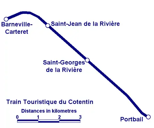 From 23 June 1990, the TTC also runs trains between Barneville-Carteret and Portbail on a 9 km (5.6 mi) long section of track. Its main hauling power being a set of three 1930S passenger coaches and the BB63069. The X2426 sold to PontAuRail in 1995 and the X3825 to Quercyrail in 1998.