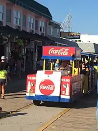 The Tramcar is colored yellow and blue, though sometimes contains other colors due to advertisements.[1] It is well known for the phrase "Watch the tramcar, please," a pre-recorded alert voiced by local Floss Stingel in 1971 to clear the tramcar's path.[3] The tramcar fare is $4.00.[4] At a haunted house ride at one of the piers, there is an old tramcar at the side of the track that has a skeleton in it that says, "Watch the tramcar, please!!", as a parody of the boardwalk tramcar alert.