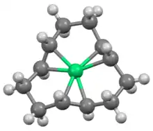 trans,trans,trans-(1,5,9-Cyclododecatriene)nickel(0) a organonickel compound with the formula NiC12H18, better known as t-Ni(cdt). It is a 16-electron coordination complex featuring trigonal planar nickel(0) bound to the three alkene groups in the cyclododecatriene ligand.[1] X-ray structural analysis demonstrates that the three olefins adopt a propeller-like arrangement around the nickel atom center, making the structure chiral.[2] This extremely air-sensitive deep red solid was the first discovered Ni(0)-olefin complex.[3]