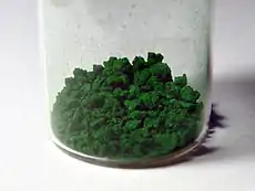 trans-Dichlorobis(ethylenediamine)cobalt(III) chloride is a salt with the formula [CoCl2(en)2]Cl (en = ethylenediamine). It is a green diamagnetic solid that is soluble in water. It is the monochloride salt of the cationic coordination complex [CoCl2(en)2]+. One chloride ion in this salt readily undergoes ion exchange but the two other chlorides are less reactive, being bound to the metal center. The more stable trans-dichlorobis(ethylenediamine)cobalt(III) chloride is also known.