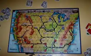 TransEuropa is a game almost identical to TransAmerica, except set in Europe. The graphical design has slight differences, with the cards featuring landmarks, not the location in relation to the board. Although the rules are exactly the same, some argue that TransEuropa is harder than TransAmerica because there is more rough terrain, and more tricky city placement.