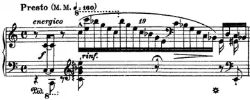 Octaved Cs begin the piece, immediately followed by a downward run made up of an arpeggiated C7 chord. A furious set of impetuous notes then climb slowly, and it returns to the octaved Cs and the downward run. The furious set of notes climbs even higher and a set of loud chords blare in fff. The left hand then plays some loud, low pitched trills in succession. After that, the right hand plays some intense arpeggiated figures, and then a final closing chord. This étude is one of the less difficult to play along with Transcendental Étude No. 3 (Paysage).[1]