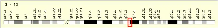 This image shows the cytogenetic band of human chromosome 10 and the various gene locations on it. TMEM254 can be seen at the thin red band with the box around, placed at q22.3.[2]