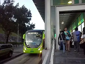 Buses run down the middle of the street, separated from other traffic, and stop at stations approximately every kilometre. The stations are in the middle of the street, located near areas of heavy pedestrian activity. Platforms are elevated so as to be level with the floor of the bus. Passengers may access the station via stairways, street crossings, or in some places, tunnels. Elevator access for the disabled is not presently available. However, individuals requiring accessible entry can cross the street to access transportation through gates painted with a wheelchair logo. Roofs in the stations are covered with a transparent plastic covering.