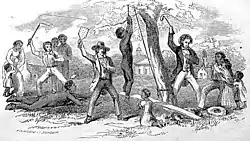 Slaves were punished for a number of reasons: working too slowly, breaking a law (for example, running away), leaving the plantation without permission, insubordination, impudence as defined by the owner or overseer, or for no reason, to underscore a threat or to assert the owner's dominance and masculinity. Myers and Massy describe the practices: "The punishment of deviant slaves was decentralized, based on plantations, and crafted so as not to impede their value as laborers."[20] Whites punished slaves publicly to set an example. A man named Harding describes an incident in which a woman assisted several men in a minor rebellion: "The women he hoisted up by the thumbs, whipp'd and slashed her [sic] with knives before the other slaves till she died."[21] Men and women were sometimes punished differently; according to the 1789 report of the Virginia Committee of the Privy Council, males were often shackled but women and girls were left free.[21]