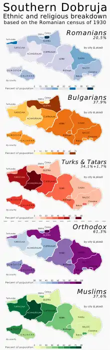On the insistence of Romania, the treaty involved a population exchange.[7] The 103,711 Romanians who lived in the area were forced to leave their homes and move to Northern Dobruja, and the 62,278 Bulgarians residing in the northern part were forced to move to the south.[2][3] Most of those Romanians were settlers who had emigrated to Southern Dobruja after the Treaty of Bucharest, which assigned the region to Romania.[8] The Aromanian settlers, most of whom were native to Greece, were counted as Romanians and also left the zone.[9] The case of the Megleno-Romanian settlers was not different; they were deported from Southern Dobruja and settled in the village of Cerna within Romanian borders.[10]