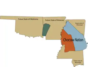 The Treaty of Doak's Stand (7 Stat. 210, also known as Treaty with the Choctaw) was signed on October 18, 1820 (proclaimed on January 8, 1821) between the United States and the Choctaw Indian tribe. Based on the terms of the accord, the Choctaw agreed to give up approximately one-half of their remaining Choctaw homeland. In October 1820, Andrew Jackson and Thomas Hinds were sent as commissioners who represented the United States to negotiate a treaty to surrender a large portion of Choctaw country in Mississippi. They met with tribal representatives at Doak's Stand on the Natchez Trace. They met with the chiefs Pushmataha, Mushulatubbee, and Apuckshunubbee, who represented the three major regional divisions of the Choctaw. Chiefs of the towns and other prominent men accompanied them, such as Colonel Silas Dinsmoor.